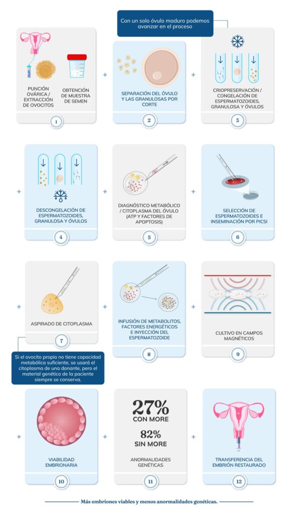 Se realiza la restauración ovular, infundiendo factores energéticos y mitocondriales para reforzar las deficiencias del óvulo tratado. Se puede requerir utilizar citoplasma de óvulos donados, sin afectar la carga genética del óvulo de la paciente.